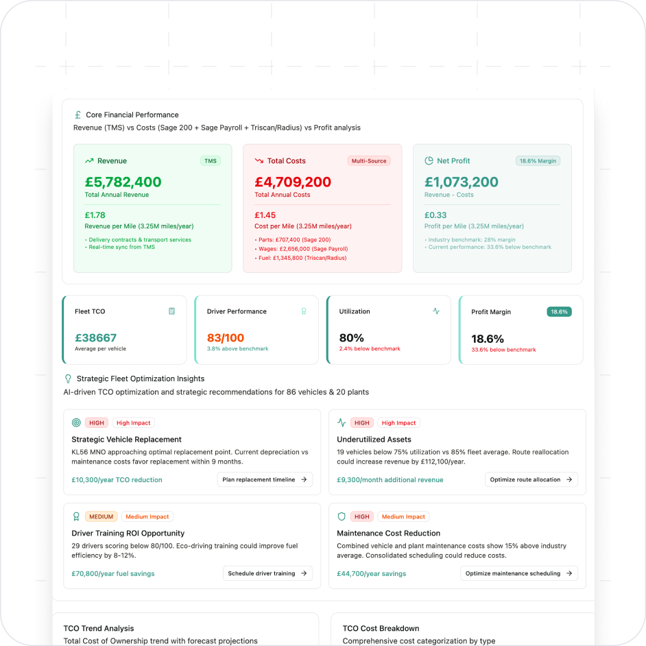 Comprehensive TCO Breakdown – Track all cost: driver payroll, fuel & energy, maintenance, insurance, depreciation and more.